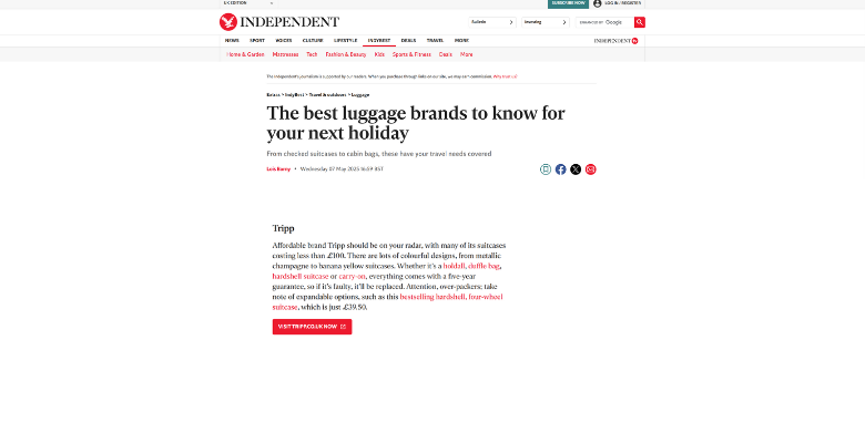 Tripp was featured in The Independent’s round-up of the best luggage brands in the UK, where we were recognised for combining style, quality and affordability. The piece praised Tripp as a go-to choice for travellers looking for reliable luggage that performs well without the high price tag. Our expandable designs were highlighted as especially useful for overpackers, offering the flexibility to fit in those last-minute extras.